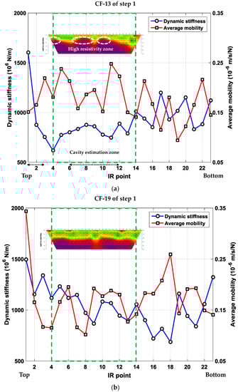 Figure 8a, the cavity estimation zone based on GPR was located at IR points 1–3 and 6–12. However, the IR points when including the IR and ERT results of the cavity estimation zone were 6–12. As a result of the ERT survey of IR points 6–12, it was possible to identify an anomaly zone with a high resistivity effect within a depth of 2 m. As a result of the IR survey in this section, it could be confirmed that the dynamic stiffness was low and the average mobility was higher than at the other points. Therefore, this section could predict the presence of cavities between the support layers and concrete with poor quality. In