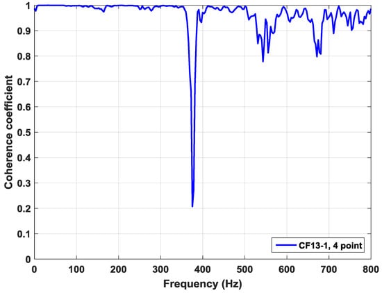 Figure 9 shows a consistency analysis of IR point 4 with the lowest dynamic stiffness at CF-13 in step 1. A consistency analysis was conducted using two measurements at the same point for statistical consistency of the frequency sounding measurement. As a result of the analysis, the coherence factor showed a high reliability with a maximum value of 0.99 and an average value of 0.96 or more. However, when the frequency was higher than 300 Hz, the coherence factor was reduced to about 0.2, and a factor of between 0.8 and 1 indicated that the reliability of the average mobility was slightly lowered. As shown in
