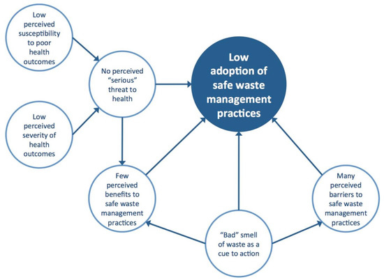 Whether or not a farmer develops an agriculture-related illness depends on a variety of environmental, agent, and host factors. An important host factor is the perception of risks among farmers, which influences how they manage these risks [16]. While a number of studies have described waste management practices of farmers in Vietnam [5,17,18,19,20], few have analyzed their perceptions of health risks associated with waste management practices [5,19,21]. Furthermore, despite the role researchers and policymakers play in shaping waste management regulations for farmers [19,21], even fewer studies have considered researchers’ and policy makers’ perceptions of why farmers decide to adopt safe or unsafe excreta and waste management practices. As such, it is difficult to assess waste management health risks and develop successful public health interventions because understanding hygiene behavior is an essential component of risk assessments and interventions [21].