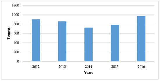 Since the inception of the swine industry back in 1990, pork production has remained relatively low in Swaziland, failing to meet the domestic demand over these years [13]. To explain how the industry has remained in a state of infancy, we can reflect to domestic production capacity for pork over the past five years. Figure 1 shows stagnant growth: 900.09, 856.85, 724.68, 785.07, and 916.10 tonnes between the years 2012, 2013, 2014, 2015, and 2016. The low domestic production capacity implies that, currently, there is high demand for pork, meaning that the industry is highly profitable and attractive to farmers. Perhaps, the low supply of pork can be explained by the fact that the industry is mainly dominated by smallholder farmers, who have limited access to resources and technology that could enable them to scale up their production capacity [30].