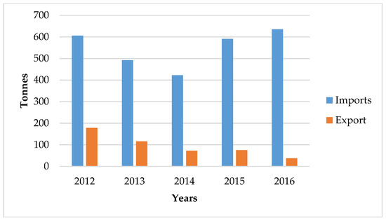 However, in spite of the low domestic supply, pork has remained the most accepted meat among all meat products in Swaziland [31]. In order to meet domestic market demand for pork, the country heavily relies on imports [13,31]. Over the years, the amount of pork imported into the country has been increasing steadily (Figure 2). The significant increase was from 422.2 to 591.21 and to 635.95 tonnes in the years 2014, 2015, and 2016 [31]. Accordingly, the amount of exported pork dropped significantly as well, from 74.81 tonnes in 2015 to 37.10 tonnes in 2016 [31].