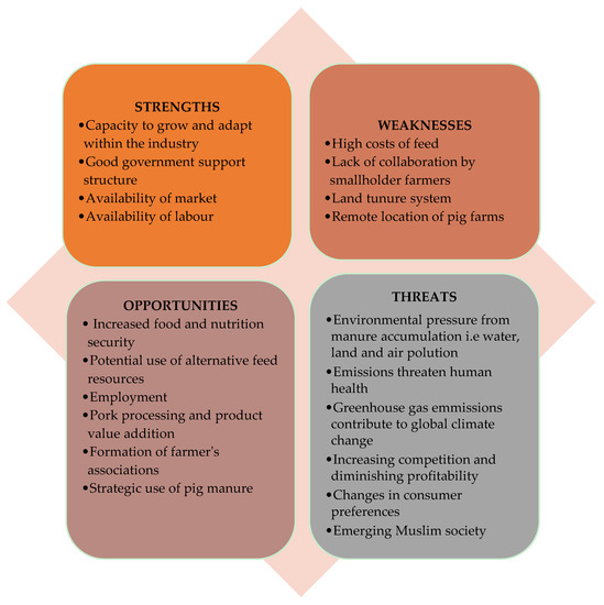 In this work, we intend to develop resilient pig production strategies to be adopted by smallholder farmers to survive market shocks and other production challenges related to climate change. In order to retain a competitive edge within the industry, [75,76,77] suggested that the analysis of current and future market competition is crucial for a predetermined response. References [77] further suggested that the response should be guided by the following questions: what is driving the competition currently and in the future? Who are current and future competitors? What are they likely to do in order to survive competition? And how can the industry respond in order to achieve and sustain a competitive advantage? In an attempt to address these concerns, Figure 3 shows the identified SWOT factors.