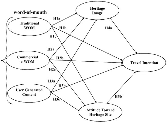 Carl [32], precisely as Naqvi et al. did [33], stated that traditional WOM can be defined as “face-to-face communication about products or companies between those people who were not commercial entities”. Gupta and Harris [34] stated that consumer behavior was strongly and significantly influenced by consumer-to-consumer communication. Tourism-related products and services are intangible in nature. Hence, the creditworthiness of the available information is considered noteworthy for users in minimizing the risks associated with the consumption of products and services [19,35]. Traditional WOM uses face-to-face communication, plays a key role in consumer choice, and has an important influence on the decision-making process and consumer purchasing behavior. The information obtained from strong tie-based connections is more credible and reliable than those with weak-tie connections [36]. According to Jalilvand et al. [9], traditional WOM significantly influenced behavioral intentions and consumer attitudes. Steffes and Burgee [37] conducted a study to check the influences of traditional and electronic WOM on students’ course decision making and concluded that online information seekers preferred information that belonged to strong ties. Bieger and Laesser [38] found that information obtained from strong-tie connections (such as friends and relatives) was the most credible and reliable. Mehmood, Ahmad, and Khan [39] also found a positive association between tourists and immigrants based on strong ties with family and friends. Tourists use strong ties based on WOM information for decision-making and the formation of destination image [38]. Travelers may use information obtained from both traditional WOM and e-WOM in the decision-making process and destination image formation process [7]. Moreover, the decision-making process is strongly influenced by traditional WOM instead of e-WOM [8,40]. Therefore, it can be strongly concluded that traditional WOM is one of the drivers of travel intention, attitude, and destination image. Similarly, it is anticipated that heritage image, attitude toward heritage sites, and travel intention toward heritage sites could be influenced by traditional WOM. Hence, we hypothesized: