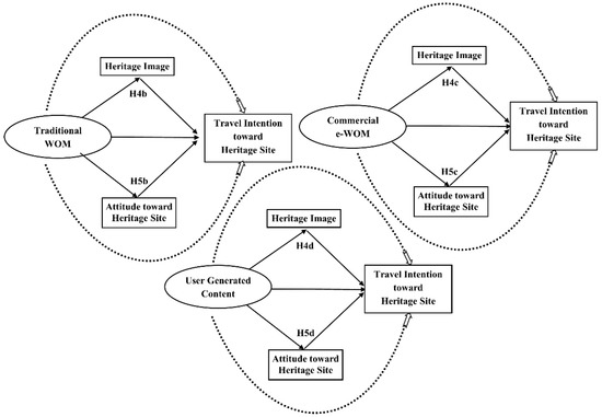 Based on these notions, it is supposed that tourists’ positive attitudes toward the destination could lead toward positive travel intention. Other than employing a direct effect of WOM on travel intention, attitude could mediate the relationship between WOM and travel intention. Correspondingly, it is expected that the relationship between WOM (traditional, commercial e-WOM, or UGC) and travel intention toward heritage could be mediated by the attitude toward heritage sites. Hence, the following three hypotheses concerning mediating roles were established: