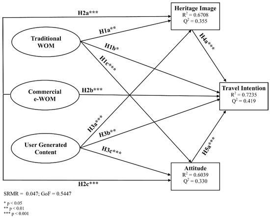 where is the latent variable and is a parameter of the structured model that represents the nexus between and . The values of R2 = 0.25, 0.50, and 0.75 refer to weak, moderate, and strong, respectively [78]. The structured model explained 72.35% of the variance in travel intention toward heritage sites, 67.08% of heritage image, and 60.39% of attitude toward heritage sites. The values of R2 were between relatively moderate and substantial [88]. Given the lack of providing the overall fit statistics in PLS, researchers and academics have recently begun to use goodness of fit (GoF). Therefore, we also computed the value of the GoF to check the overall quality of our proposed model. Following the suggestion of Tenenhaus et al. [103], the value of the GoF was computed as (see Tenenhaus et al. [103] for detailed information on the GoF computation: Here, the communality of TWOM, CEWOM, UGC, HI, ATHS, and TITHS denoted 0.452, 0.493, 0.387, 0.454, 0.422, and 0.422, respectively):