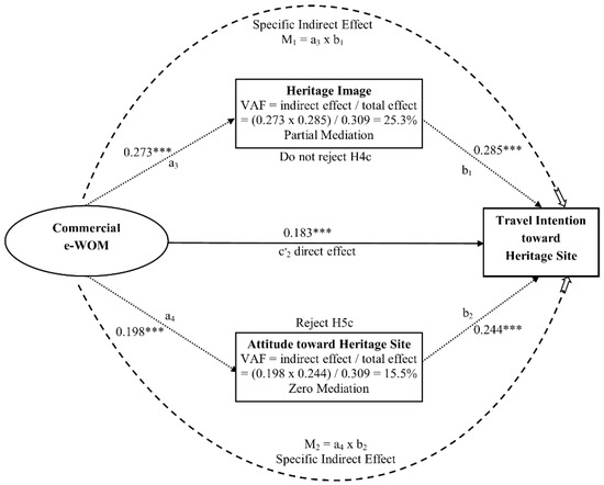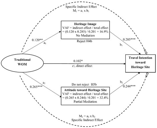 To sum up, it was expected that exogenous variables could directly, positively, and significantly influence travel intention toward the heritage site. Moreover, it was also expected that the relationship between WOM (traditional, commercial, or UGC) and travel intention toward heritage sites could be mediated by heritage image and attitude toward heritage sites. In this vein, based on the above-mentioned details and the literature review, and despite the significance of heritage image, attitude toward heritage sites, and word-of-mouth in the area of heritage tourism, we proposed a multimediation model as illustrated in Figure 1 and Figure 2.