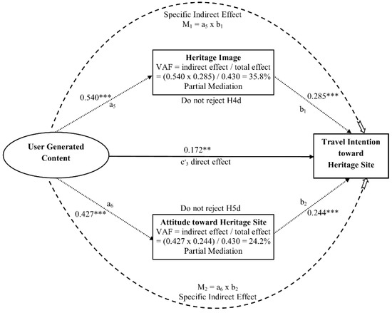 Traveling to heritage sites represents a growing sector with great potential in the context of heritage tourism, which is a relevant topic but has received little scholarly attention. The present study tries to bridge this gap by investigating the mediating role of heritage image and attitudes toward a heritage site in the relationship between user-generated content (UGC) and travel intention toward a heritage site. In particular, we applied partial least squares structural equation modeling (PLS-SEM), which is a relatively popular new method, instead of the traditionally used covariance-based structural equation modeling (CB-SEM) method. The rise in popularity of PLS-SEM has been particularly noticeable since 2013, but in the area of heritage tourism, research is still in an early stage of development because the heritage discipline has hardly exploited the benefits of this approach. We proposed a multimediation model for heritage tourism to address this relatively new research avenue. It was discovered that exogenous variables directly and indirectly influenced travel intentions toward a heritage site through their mediators (i.e., heritage image and attitudes toward a heritage site). The findings provide an appropriate empirical and theoretical conclusion as well as valuable insights for heritage management organizations (HMOs) into the performance of heritage tourism, both for local professionals and the host communities that assist in increasing the development of heritage tourism.
