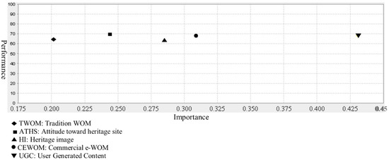 Cohen’s f2 was used to check the degree of contribution by an exogenous variable in terms of R2 to explain the endogenous variable. The values of f2 = 0.02, 0.15, and 0.35 were referred to as a weak, moderate, and strong effect size of the constructs, respectively [107]. Specifically, the f2 value was large (UGC → HI, f2 = 0.39, over 0.35), which showed a large effect between UGC and heritage image. There was a moderate effect between UGC and attitude toward heritage site (UGC → ATHS, f2 = 0.20, over 0.15) and between commercial e-WOM and heritage image (CEWOM → HI, f2 = 0.15, equal to 0.15). The f2 values met the base level criteria of 0.02 in the case of the remaining relationships.