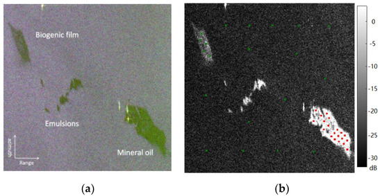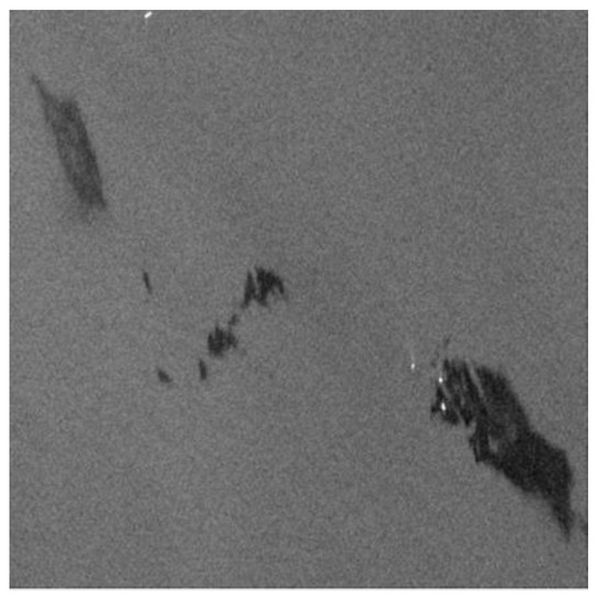 The pseudo colour image of the data is shown in Figure 2a, where three verified slicks can be witnessed: biogenic film (Radiagreen ebo, the upper left), crude oil (Balder oil, lower right) and emulsions (Emulsion of Oseberg blend with 69% water, middle). The original width of the RS-2 image is 25 km, with range resolution around 5 m. The volume of release of emulsion and crude oil is 20 m3 and 30 m3, respectively. The slicks were released 5–9 h before the SAR acquisition when the local wind speed is 1.6–3.3 m/s. The slicks covered thousands of square meters of sea surface. More detailed information about the experiment can be found in [24].
