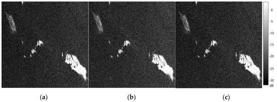 VV2 image of polarimetric SAR data filtered by different filters. (a) Boxcar filter; (b) Refined Lee filter; (c) Lopez Filter.