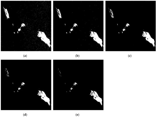 Thresholding result derived from the smoothed VV2 image, with the thresholding of −20 dB, −21 dB, −22 dB, −23 dB, −24 dB (a–e).