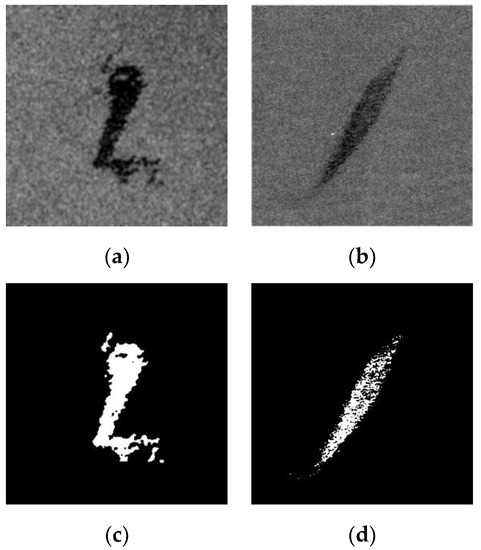 The very same algorithm applied in previous sections was conducted on the SIR-C data, and the oil spill detection results are shown in Figure 9c,d. It can be observed that both of the slicks can be detected from the noisy sea background, with very integrate boundaries.