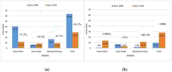 An improvement of vegetation cover was one of the medium-term outcomes revealed by the key informants. In Ararso-Bero and Sara-Areda, leaders of development teams and village elders noted that the barren land has changed into green vegetation in micro-watersheds that were successfully enclosed. They related this change to the regeneration of natural species. The informants also stated that vegetation cover improved weather conditions and precipitation around the micro-watersheds, attracted wild animals, and enhanced the availability of grasses and woods. Data obtained through Google Earth Engine indicates that the coverage of grassland was reduced while the coverage of forestland was increased in Ararso-Bero. This was opposite in Sara-Areda, as shown in Figure 2. In Qachachule-Guja, all key informants stated that the program has had very limited contribution to the improvement of vegetation cover. Particularly, extension workers stated that the program has exacerbated land degradation because of the increased competition among farmers to use and/or fence off a portion of the micro-watersheds. But as seen in Figure 2, the coverage of forestland increased, most probably because farmers who fenced off portions of the micro-watersheds were better conserving the land.