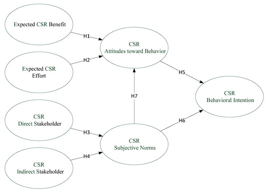To be specific, attitude towards behaviors and subjective norms will affect the behavioral intention of an individual to carry out a specific behavior. In addition, Ajzen and Driver found that subjective norms have no direct effect on behavioral intention; on the contrary, it indirectly affects intention through attitude [63]. Our study posits that subjective norms will influence attitude while putting CSR into action. According to above studies, we assert: