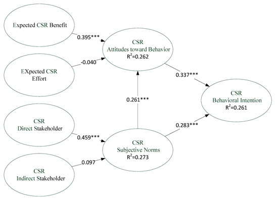 Our study adopts structural model to test the research model; in structural model, the strength of influence between variables can be revealed through testing the path coefficient (β). R2 shows how much variance can be explained by dependent variables, just like the explanation power in regression models. Figure 2 shows the result of partial least squares (PLS): The model fits (R2) show that it accounts for 26%, 27%, and 26% of the variance in CSR attitudes toward behavior, CSR subjective norms, and CSR behavioral intentions, respectively, which indicated an acceptable level of explanation power. Regarding the correlation between corporate attitude towards CSR practice and expected benefits, the β of H1 is 0.395 (p < 0.001); thus, H1 cannot be rejected. H2 was rejected, because corporate expected effort has a negative but insignificant impact on corporate attitude towards CSR. As for the correlation between subjective norms about CSR and corporate direct stakeholders, β of H3 is 0.459 (p < 0.001), which cannot be rejected. However, H4 was rejected, because the impact caused by indirect stakeholders on the subjective norms about CSR was insignificant. As for the impact caused by attitude, subjective norms, and behavioral intention to CSR practice, β of H5 is 0.337 (p < 0.001); β of H6 is 0.283 (p < 0.001); β of H7 is 0.261 (p < 0.001); thus, H5, H6 and H7 cannot be rejected.