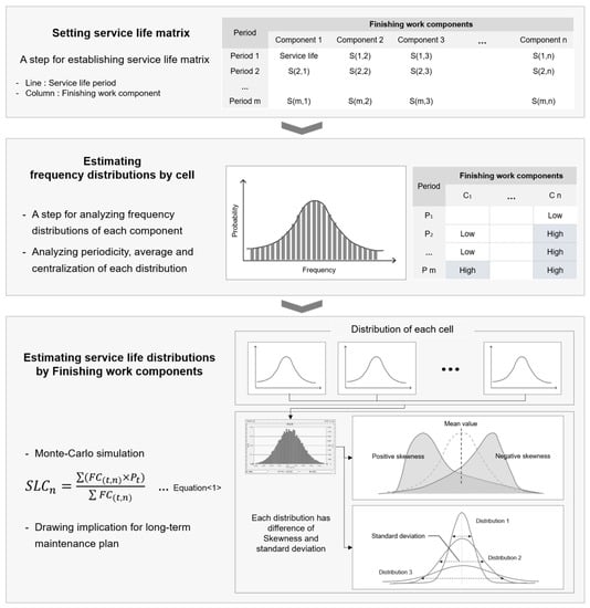 This study aims to establish the flexible and efficient long-term maintenance plans through analysis of the service life pattern of each component of finishing works. To that end, annual maintenance frequency data of public housing finishing work components have been collected. The probabilistic approach was applied based on this data, and a Monte-Carlo simulation was performed with the annual frequency distribution of each component as input. Through this simulation, the service life patterns of public housing components were analyzed from the perspective of long-term maintenance plans that reflect uncertainties. This study was conducted largely in three steps: (1) Setting up the service life matrix; (2) Estimating frequency distributions by cell; and (3) Estimating service life distribution by finishing work components [33] (Figure 1).