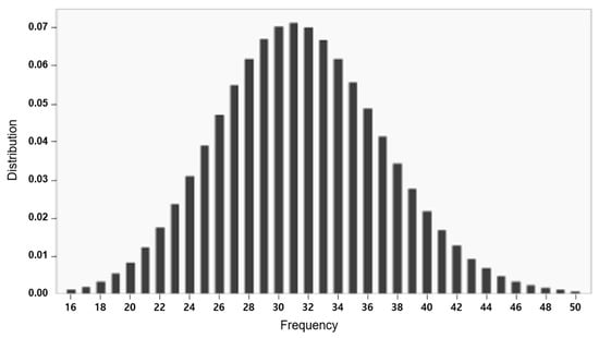 The frequency distribution of each cell was derived based on the matrix (Figure 2). The following example shows the S(14,4) of the service life matrix, which corresponds to a frequency distribution of interior finishing repairs of the 18th year. The distribution in Figure 2 was derived based on the maintenance repair frequency per period of each component in each cell, and the distributions varied as the ratios changed.