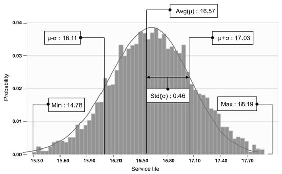 The service life distribution of each component of public housing finishing works was created by performing a Monte-Carlo simulation and was performed for the distribution of each derived cell based on Equation (1), which can reflect various cases of distributions in each cell (Figure 3). As shown in Figure 3, through the average (µ), standard deviation (σ), minimum, and maximum of the derived service life distribution, the distribution pattern, the degree of uncertainty, and skewness can be analyzed. The centralization of maintenance activities can then be determined and an efficient long-term maintenance plan can be established.
