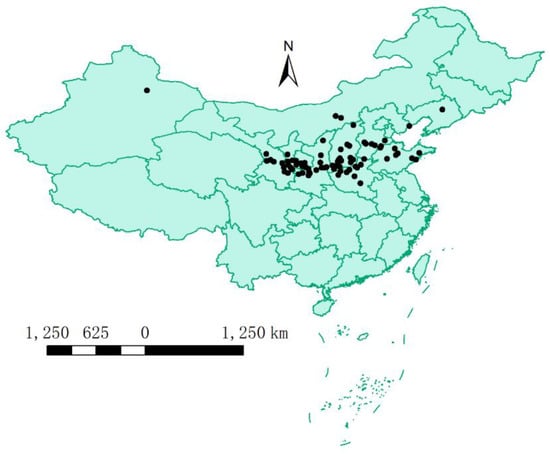 Geographic locations of the study sites. The map was generated with ArcGIS 10.2 software (ESRI, Redlands, CA, USA).