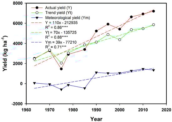 Y increased from the 1960s (2505 kg ha–1) to the 2010s (7204 kg ha–1) at a rate of 110 kg ha–1 year–1 (Figure 2). Yt increased from 2444 kg ha–1 in 1960s to 5856 kg ha–1 in 2010s (Figure 2). Ym showed a decreasing trend during 1960s–1990s, and an increasing trend during 1990s–2010s (Figure 2).