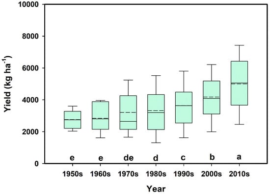 Yields followed an increasing trend after the 1950s (Figure 3). The yields in the 1970s were 311 kg ha–1 higher than in the 1950s (Figure 3). The yields in the 2000s were 28% higher than in the 1980s, and reached 4994 kg ha–1 within a decade (Figure 3).
