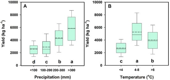 Variation in dryland wheat yield in different precipitation (A), mean temperatures (B) during wheat growth stage regions of northern Chinese areas. The black solid and dash lines, lower and upper edges, and bars in or outside the boxes represent median and mean values, 25th and 75th, 5th and 95th, and, <10th and >90th percentiles of all data, respectively. Different lower-case letters denote significantly different means (Duncan’s multiple range test; p < 0.05).