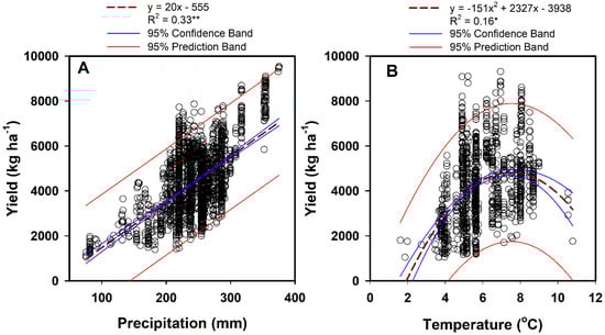 Relationship between dryland wheat yield and precipitation (A), mean temperature (B) during wheat growth stage in northern Chinese areas. *, ** indicate significance at p < 0.05, p < 0.01, respectively.