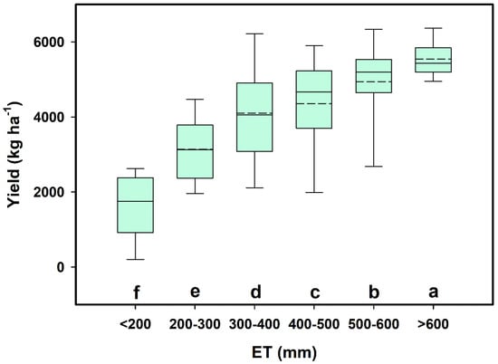 Mean yields varied greatly with levels of ET, with an increasing trend from <200 mm ET to >600 mm ET (Figure 6). Mean yield in regions with ET values < 200 mm was 79% lower than in regions with ET values in the range 200–300 mm (Figure 6). When the ET was >600 mm, mean yield was 35%, 27%, and 12% higher than in regions with ET values of 300–400, 400–500, and 500–600 mm, respectively (Figure 6). Wheat yield was closely, positively, and significantly (p < 0.05) correlated with ET (Figure 7). Thus, ET strongly influenced wheat yield in rainfall-dependent regions.