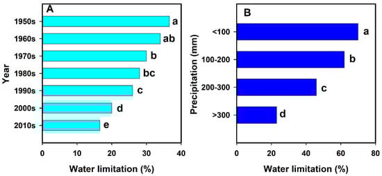 Percentage reductions in dryland wheat yield due to water limitation in different decades (A) and in regions of northern Chinese areas with different precipitation levels during wheat growth stage (B). Different lower-case letters denote significantly different means (Duncan’s multiple range test; p < 0.05).
