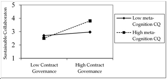 Next, H4, the meta-cognitive CQ component, is significantly and positively related to the contract governance in the enhancement of collaboration (β = 0.26, p < 0.05). The results are not contrasted with a recent study [60] and put forth that firms from a long distance and low orientation countries prefer to maintain traditions as well as awareness of the cultural preferences of different groups. The findings also support the past studies that managers with a high meta-cognitive CQ are likely to adapt to these situations when a cultural difference exists in cross-culture interaction [84]. The findings show that managers from export manufacturers in Pakistan acquire and understand cultural knowledge in cross-border interaction. The managers pay close attention to the corresponding buyer’s reactions and make a judgment to understand his/her reactions to the extent to which cultural difference bias might not influence the situation and attempt to build cultural awareness. Consistent with H4, Figure 2 shows that the relationship between metacognition CQ and contract governance is positive and significant for the collaboration. The results suggest a moderating effect of meta-cognition CQ on the relationship between contract governance and collaboration is stronger at a high level of meta-cognition CQ. Differences in firm meta-cognition CQ are associated with the different level of collaboration at low levels of contract governance.