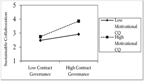 Concerning H5, behavioral CQ is argued to positively moderate the relationship between contract governance and collaboration. However, the interaction effect of behavioral CQ between CG on collaboration is not significant (β = −0.03, p > 0.01). Thus, there is no support for H5. One possible explanation for this result is that managers of export manufacturing firms in Pakistan, with contract governance with their buyers, are less likely to focus on nonverbal skills to communicate. Regarding H6, it was argued that motivational CQ positively moderates the relationship between contract governance and collaboration (β = 0.17, p < 0.05). Thus, there is no support for H6. The findings are consistent with the findings of past studies on collaboration across culture [28]. Specifically, managers from manufacturing firms in Pakistan understand and appreciate cultural differences that are different from their local norms and practices. The results support a recent study [60] and put forth that firms from an uncertainty avoidance culture directed energy and intentions to adapt to an unfamiliar cultural environment. Figure 3 shows that contract governance had a strong positive effect on collaboration when the firm motivational CQ is high. Specifically, in contract governance, managers do not direct their efforts to understand these differences when interacting with buyers from different cultures. This result is similar to the previous studies on cultural judgment and task performance that surveyed firms are not likely to modify their actions and behaviors to adapt to different situations [55].