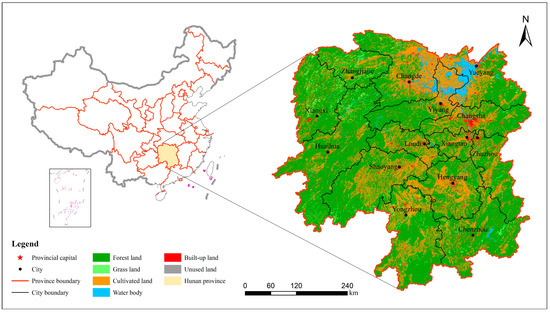 The object of this study is Hunan province (108°47′~114°15′ E, 24°38′~30°08′ N). It is located in the central China, covering 13 prefecture-level cities and one autonomous prefecture (Figure 1). Most of the provincial boundaries are located in the south of Dongting Lake. The Xiangjiang River, the largest river in the province, runs through the north and south of the province. It covers about 21.1836 million hectares, accounting for about 2.2% of the total land area of the whole country; the permanent population is about 68.22 million. In 2015, its GDP was 2.90472 trillion Yuan (RMB), and the per capita GDP reached 42968 Yuan (RMB), which ranked ninth and sixteenth in China respectively [47,48].