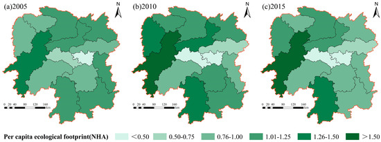 Furthermore, we discuss the spatial distribution of ecological footprint in Hunan province based on the per capita ecological footprint. Figure 3 shows that the distribution pattern of the per capita ecological footprint in Hunan province. The high value areas of per capita ecological footprint are mainly distributed in the west and north of Hunan, while the low value areas are mainly in Xiangtan and Loudi of the central Hunan. Among them, the per capita ecological footprint of Huaihua is obviously higher than that of other cities, whose annual average is 1.61 NHA, followed by Yongzhou in southwest of Hunan, 1.34 NHA. The lowest per capita ecological footprint is Xiangtan with an annual average of 0.42 NHA, and the secondary lower is Loudi, 0.49 NHA. According to the spatial distribution difference, the annual average of per capita ecological footprint in Huaihua is 3.83 times that of Xiangtan.