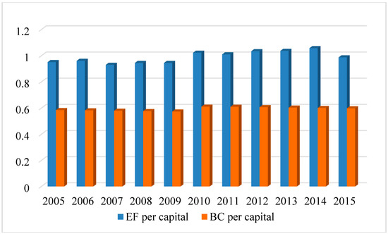The ecological carrying capacity of Hunan can be obtained according to the Formula (2). The results show that the ecological carrying capacity of Hunan Province remains basically stable during the sample period (Figure A1 in the Appendix A). Among them, the ecological carrying capacity of arable land is the highest, with the total ecological carrying capacity is about 1859.6 × 104 NHA, which accounts for 49.3% of the total ecological carrying capacity in Hunan. Followed by forest and build-up land, and the total ecological carrying capacity of forest land is basically stable at 1183.8 × 104 NHA, which accounting for about 31.4%. During the sample period, the ecological carrying capacity of build-up land increased from 693.37 × 104 NHA to 759.96 × 104 NHA, in 2015. In addition, the ecological carrying capacity of grazing land and water body was very small, accounting for only about 0.1% of the total ecological carrying capacity in Hunan. The per capita ecological carrying capacity of Hunan increased from 0.585 NHA in 2005 to the maximum (0.611 NHA) in 2010, and then decreased to 0.598 NHA in 2015.