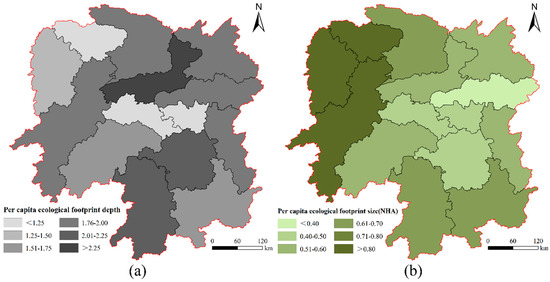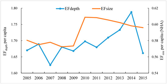 Additionally, it can be inferred that EFsize = EF/EFdepth [50], which is the amount of natural capital flow occupied each year to meet the needs of human production and consumption. Because the consumption of capital flow could not reduce the natural capital, so . Compared with the two-dimensional model, the ecological footprint size in the three-dimensional model can represent the equity differences of resource consumption and ecological services between different regions in the same period. The ecological footprint depth in the three-dimensional model can represent the equity difference of resource consumption and ecological service between different periods in the same region, so that the comparability of ecological footprint in different regions and different periods can be enhanced.