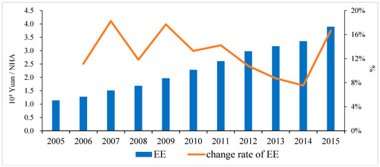 The ecological efficiency of Hunan is calculated by using the Formula (6), and the results are shown in Figure 7. It shows that the ecological efficiency is improving continuously, and its value is increased from 1.591 × 105 Yuan/NHA (GDP is calculated by constant price in 2005) to 5.456 × 105 Yuan/NHA, with an average annual growth rate of 13.12%.