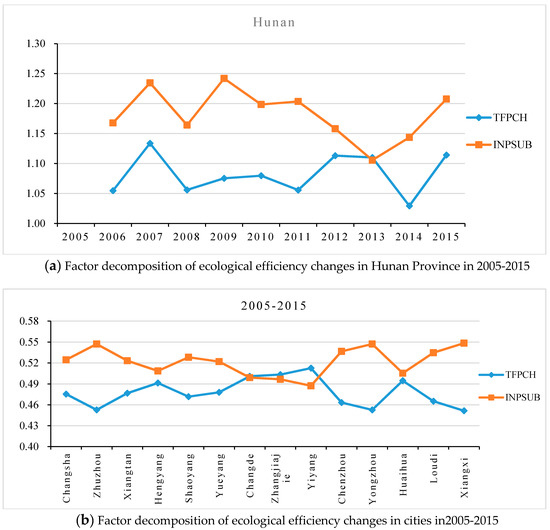Figure 8b shows the average annual change in total factor productivity and factor substitution rate in each city from 2005 to 2015. Obviously, the change in factor substitution rate is the main reason for the improvement of ecological efficiency in most cities. However, the improvement of ecological efficiency in Changde, Zhangjiajie, and Yiyang is mainly due to the increase in total factor productivity.