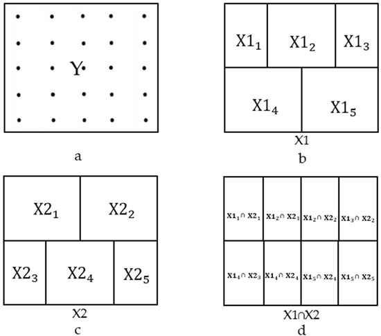Example of interaction detection principle: (a) pattern of house price, (b) subareas divided by facility X1 accessibility, (c) subareas divided by the facility X2 accessibility, and (d) subareas divided by the accessibility of X1∩X2.