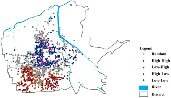 Local indicators of spatial association (LISA) map of housing prices in Xi’an, China.