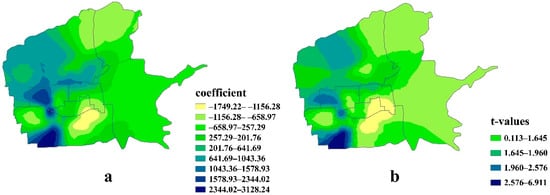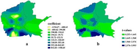 Distribution of regression coefficients and t-values of cultural and sports facilities: (a) regression coefficients and (b) t-values.