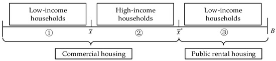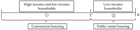 Let represent the demarcation separating urban and suburban areas and represent the boundary of the city. According to A5, among low-income households, only a few of them can be provided with public rental housing, and the rest have to choose commercial housing with high-income households.