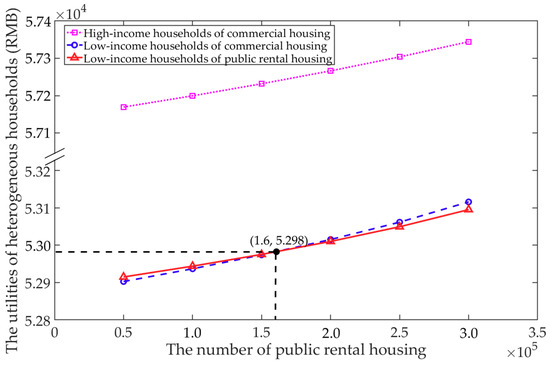 (2) The utilities of heterogeneous households are positively correlated with the number of public rental housing, but there will be a critical value, making the utility of the low-income household choosing public rental housing lower than that choosing commercial housing. It means that ultra-limit public rental housing with a remote location is bad for low-income households.