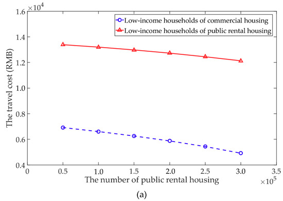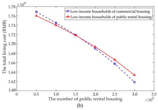In order to illustrate the problem further, Figure 6 shows the total living cost and travel cost for low-income households with the same floor space but different housing with the different number of public rental housing, respectively. When the number of public rental housing exceeds 300,000, the minimum floor space of low-income households choosing commercial housing has exceeded 15 m2, so it is not considered. Figure 6a shows that the travel cost of the low-income household choosing commercial housing is far less than that choosing public rental housing. With the increasing of the number of public rental housing, the change rate of travel cost is greater when low-income households choose commercial housing. Figure 6b shows that total living cost of low-income households choosing different housing. We can know that total living cost of the low-income household choosing commercial housing is lower than that choosing public rental housing when the number of public rental housing exceeds the critical value, which is consists with our results. Anyhow, although the rental price of public rental housing is lower than commercial housing, the total living cost of the low-income household choosing public rental housing is not low when too much public rental housing was built. It is mainly caused by the remote location of public rental housing. Hence, large-scale public rental housing may be not beneficial for low-income households.