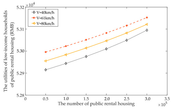According to Equations (55)–(57), the impact of the number of public rental housing on the utilities of heterogeneous households can be shown as Figure 4. It means that the utilities of heterogeneous households are positively correlated with the number of public rental housing. It is because in a city with the determined population, the more public rental housing is, the fewer low-income households choosing commercial housing are. It will alleviate the bid for commercial housing for heterogeneous households, making commercial housing rental price reduce, as show in Figure 5. Thus, utilities of households choosing commercial housing will increase. Meanwhile, when the number of public rental housing is less than 1.6 × 104, the utility of the low-income household choosing public rental housing is greater than that choosing commercial housing, and vice versa. It means too much public rental housing is bad for low-income households. It is because compared with low-income households choosing public rental housing, low-income households choosing commercial housing live closer to the CBD, and their travel cost is lower. When commercial housing rental price reduces to a certain extent, their total living cost (travel cost and housing cost) will be lower than households choosing public rental housing. As a result, the utility of the household choosing commercial housing grows faster. Similarly, when the average operating speed of rail changes, the results can also be found in other urban residential formations.