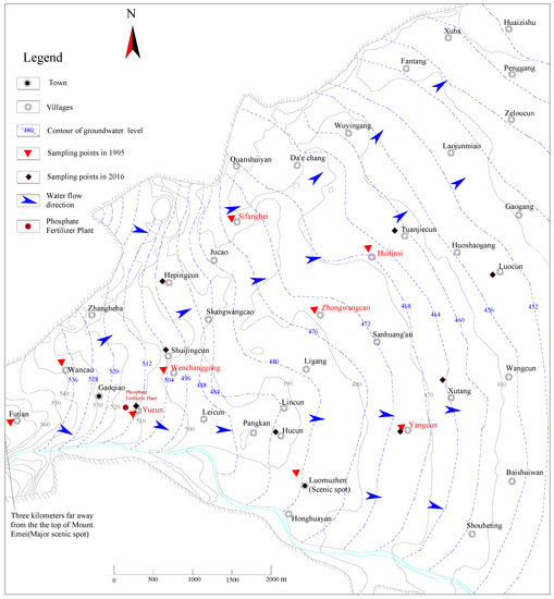 The groundwater of the Gaoqiao diluvial fan provides a water source for industrial, agricultural, and residential use. Before 1990, there was a phosphate fertilizer plant, lime mine plant, and cement plant, forming industrial pollution sources, which resulted in the deterioration of groundwater quality [3]. The phosphate fertilizer plant had produced calcium, magnesium, phosphorus, and potassium fertilizer from phosphorite ore with dolomite as a cosolvent, coking coal, and white coal by the blast furnace method since 1964. The annual output had increased from 20,000 tons in 1964 annually to 130,000 tons in 1984. Due to the high fluorine content of the raw materials and fuels, the backwardness of the production technology, a low chimney, and the absence of exhaust gas and water recovery equipment, a large amount of fluoride was discharged into the ecological and groundwater environment during the production process from the plant. The content of fluorine in the wastewater, measured by the environmental protection department in 1978, was as high as 45 mg/L. Coercive measures had been taken to eliminate fluorine in the wastewater of the plant from 1980 to 1996. However, the “dental fluorosis” of the villagers in Yucun, 100 m downstream of the plant, was still showing heavy pollution of fluorine in the groundwater from 1980s. All the industrial pollution sources had been banned since 1996 and the groundwater environment was slowly recovering.