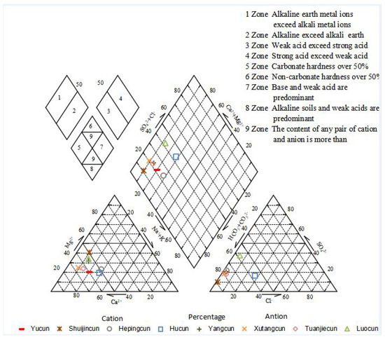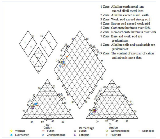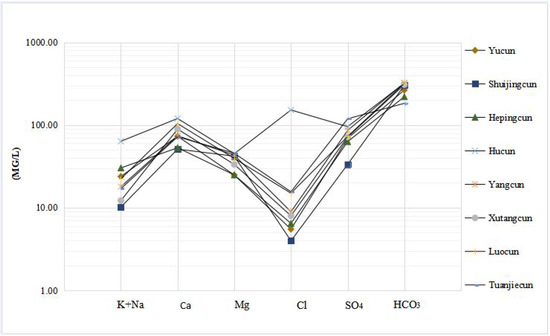 According to Schoeller’s results, the changing trend of the curve of water samples in the study area was generally similar, indicating that groundwater sources in the study area were the same. In the diagram, the slope of solute concentration in Hucun was different from others in the whole study area. The concentration of Cl− was significantly higher. The chemical components of groundwater in Hucun were the result of pollution as the water sample points were near the septic tank during the sampling proceeded.
