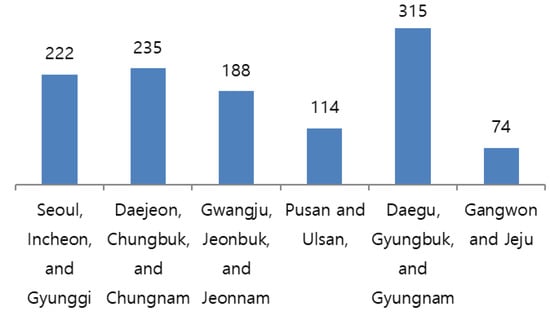 A nationwide CE survey of 1148 randomly chosen manufacturing firms was conducted by a professional polling firm through person-to-person interviews during June and July 2017. Each manufacturing company gave us eight observations. In other words, each interviewee was presented with eight choice sets and reported eight responses to the provided questions. Thus, we would get a data set size of 9184 (1148 respondents × 8 choice sets). Table 2 reports the definitions and sample statistics for some characteristics of the manufacturing firms. We selected three variables: Region, Size, and UPS. Since South Korea is classified into five mega-city regions (Seoul- Incheon-Gyunggi, Daejeon-Chungbuk-Chungnam, Gwangju-Jeonbuk-Jeonnam, and Pusan-Ulasn, Daegu-Gyungbuk-Gyungnam) and two special mega-city regions (Gangwon and Jeju), the variable Region identifies whether or not to locate in the five mega-city regions is introduced. Most manufacturing firms are located in the five mega-city regions. Size and UPS can also affect the outcomes of the CE. Figure 1 is a graph for samples classified by region.