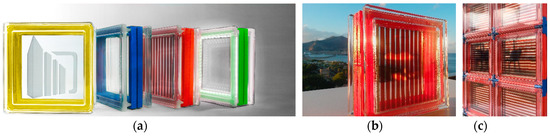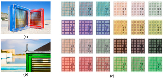 (a) Different colors of 3D glass sub-components obtained by combining the color of plastic “thermal belt” and DSCs integrated. (b) Corner detail of panel in which steel bars for the application of pre-stressing force are visible. (c) Panels’ color schemes obtained by combining the colors of 3D glass sub-components and of the supporting structure of panel made of polypropylene (PP).