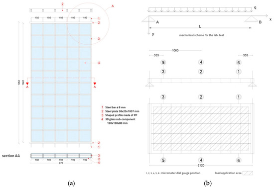 As previously mentioned, SBskin 3D glass sub-components, DSC integrated, are dry-assembled into panels through plastic molded profiles provided with holes for the passage of stiffening steel bars positioned along the prevailing dimension of panel (Figure 4a). They work as a supporting/separation structure that allow to have only 2 mm joints among the 3D glass components. Thanks to the application of the mono-directional pre-stressing force, they are able to resist against horizontal forces due to wind and earthquakes. Different laboratory and numerical tests have been already done in order to verify the relapses on the mechanical performance of SBskin panel due to different dimensions and/or materials of its sub-components DSC-integrated glass blocks [16] and plastic profiles [17,18]. Prototypes of the panel have been tested by considering loading conditions equal to those of a panel positioned at 45 m of highness and by considering the solicitations in accordance to Italian Regulation for Building Construction [19].