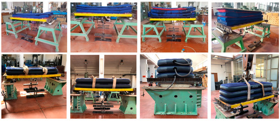 The water beds have been gradually filled during the tests (Figure 6). The value of wind pressure was calculated on the basis of a wind intensity equal to 1338 N/m and a wind speed of 28 m/s, which results in a pressure, according to the Italian regulation DM 14 January 2018, which is also known as NTC 2008 [19].